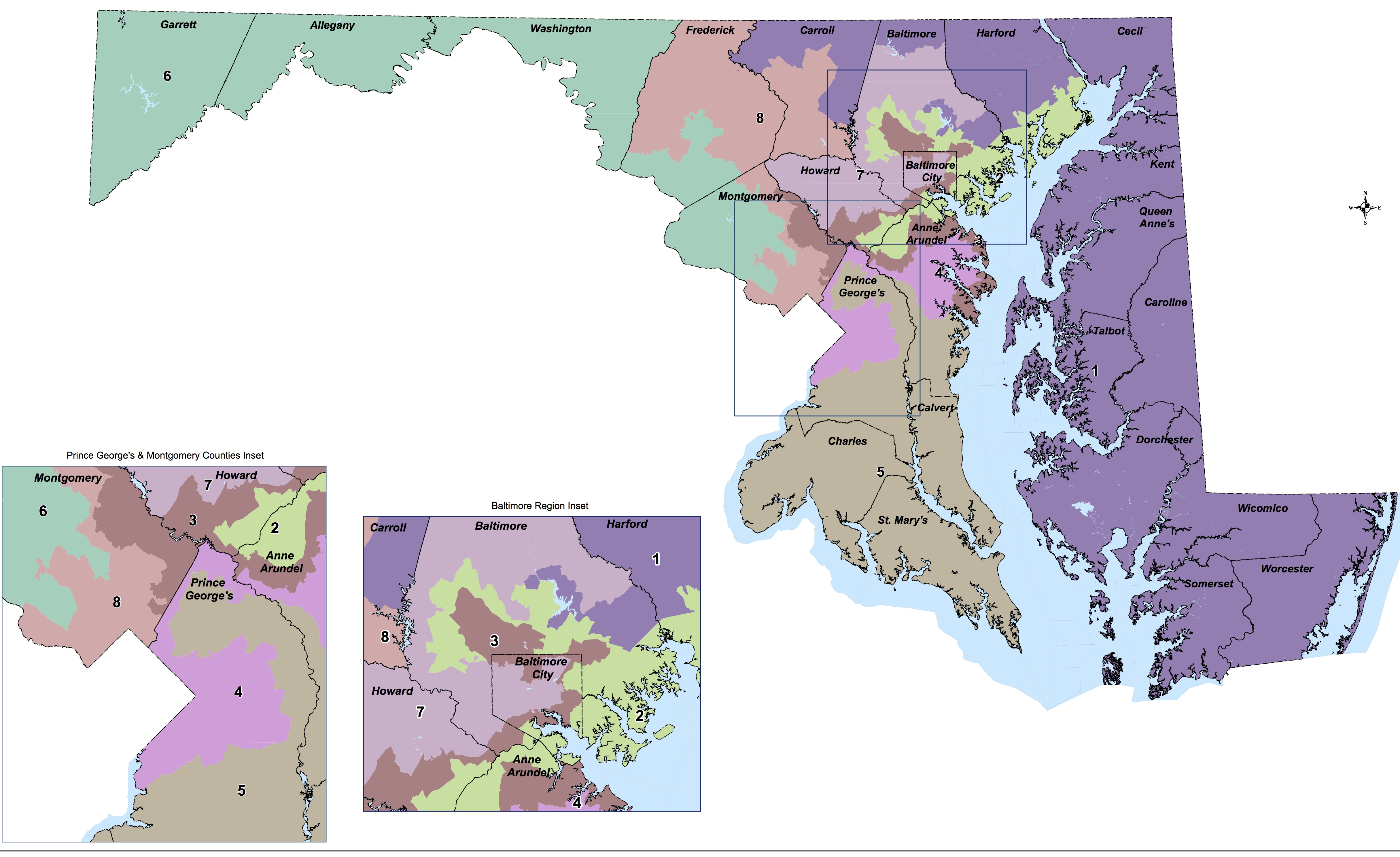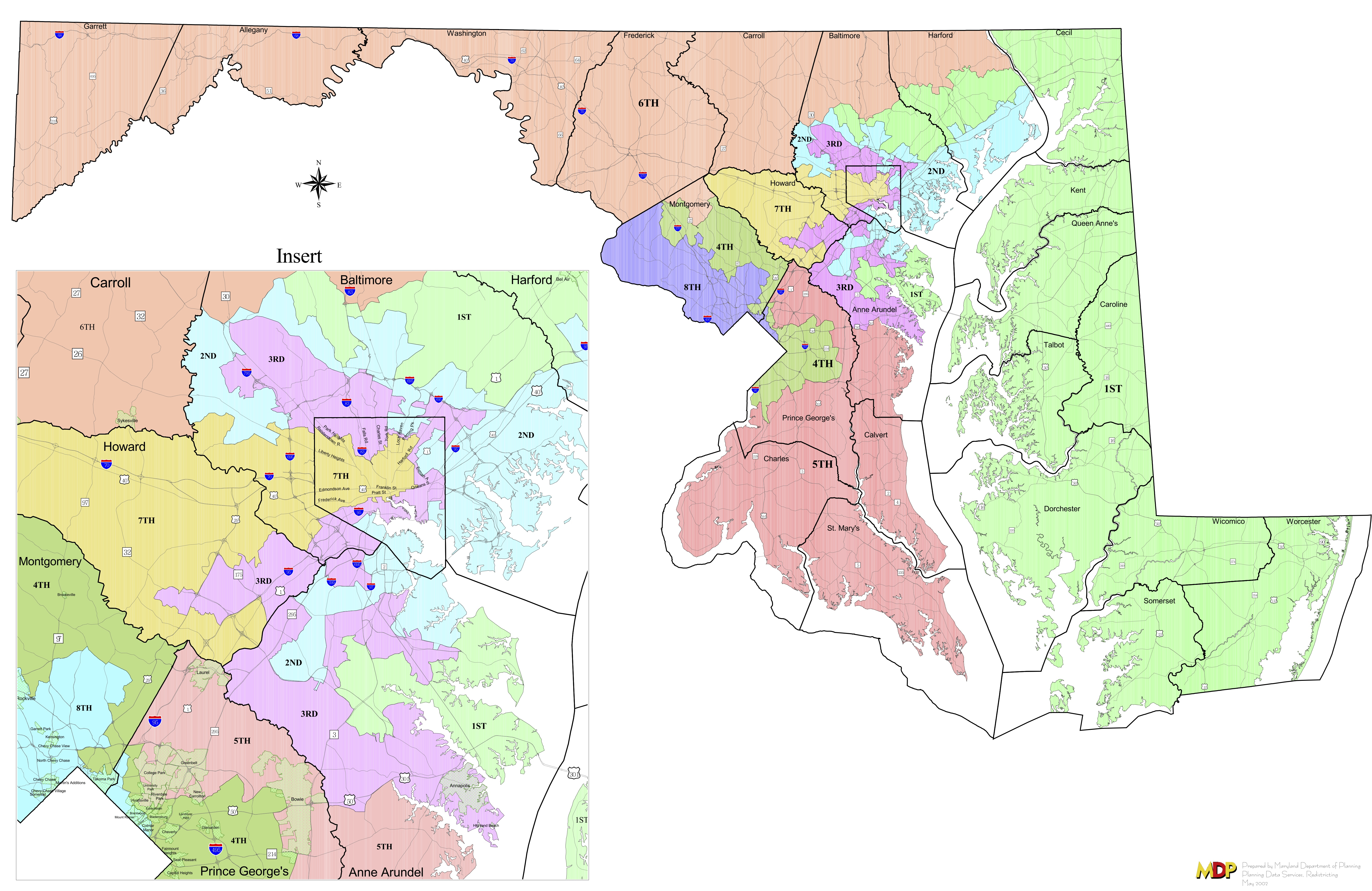 Maryland’s 2002 congressional map. The 6th District is orange; the 1st is green. (Maryland Department of Planning)