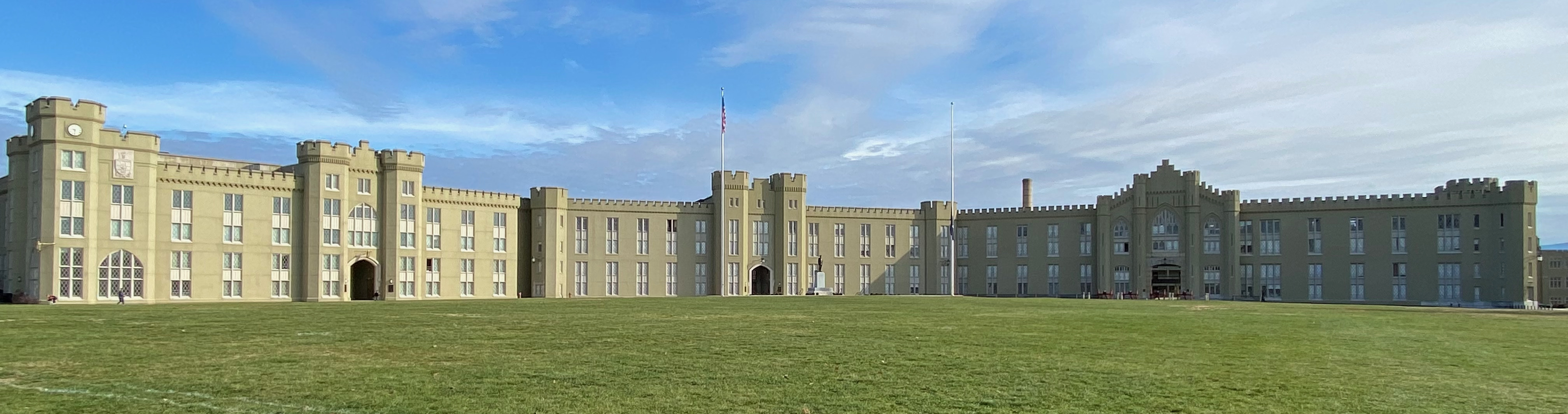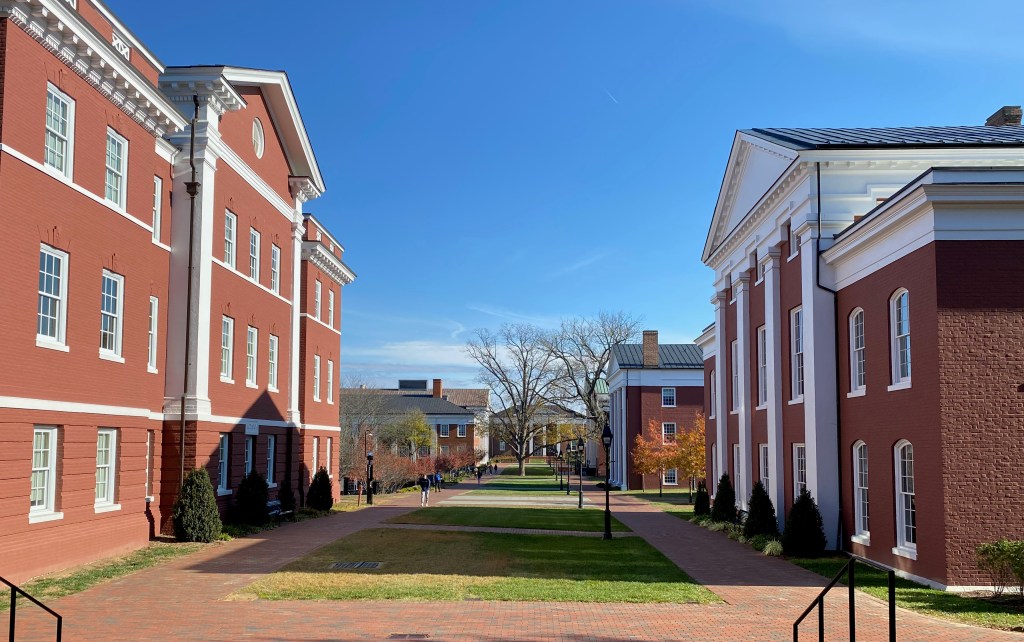 The campuses of Washington & Lee University and Virginia Military Institute abut each other. W&L looks like a classical college: Roman Revival architecture, painted red brick, white columns. Stately. The main road through W&L runs north past the Colonnade, its early buildings, and through a gate into VMI. It’s a jarring shift to Gothic Revival—think jousting knights in front of Medieval castles—brick painted a faded green.
