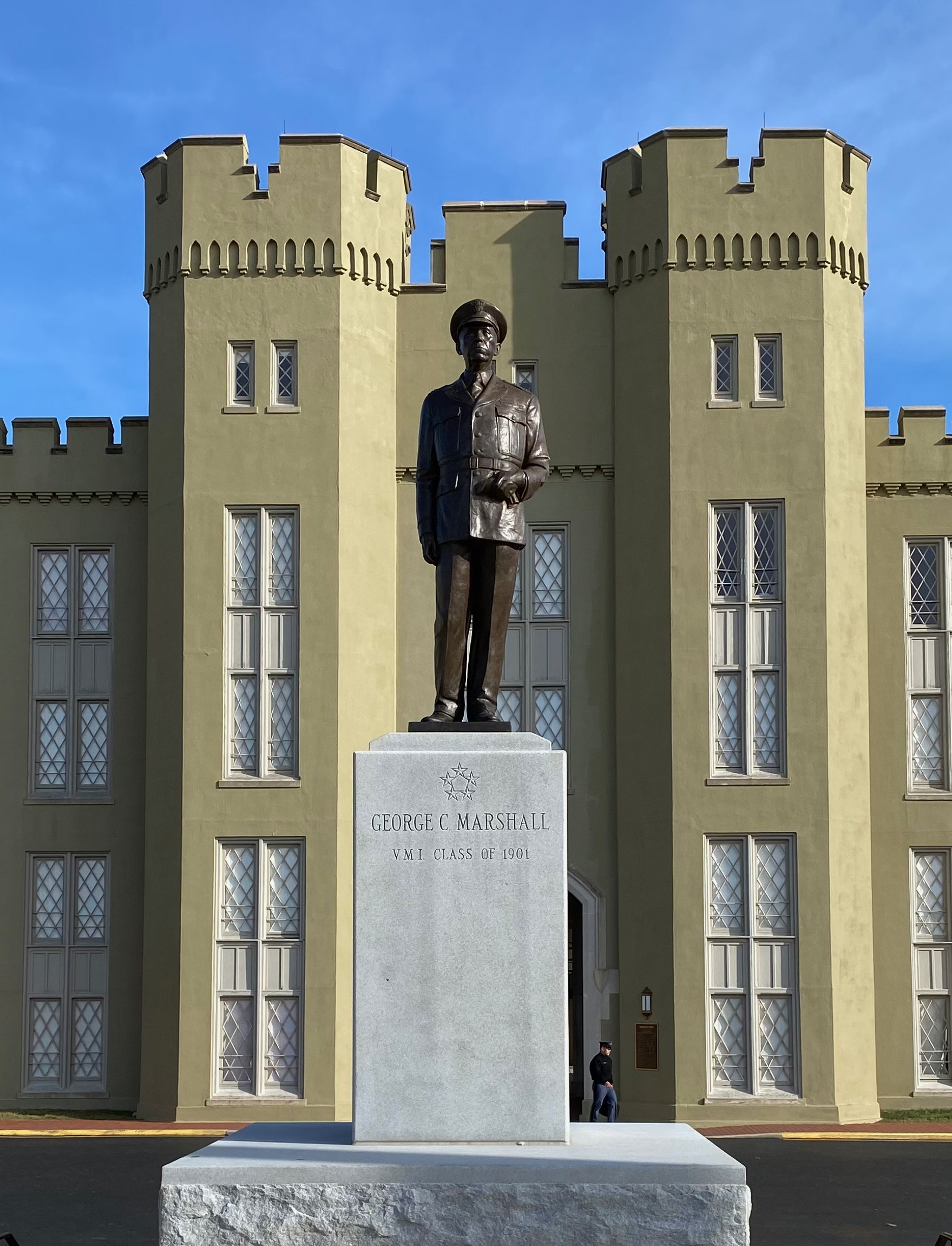 The road opens to the parade ground. Wrapping around the far end to the north is a single, enormous building, perhaps 250 yards wide, concave angles forming three sections. As I approach, a bronze statue comes into view: George Marshall, the school’s most revered alumnus. On opposite sides of the center archway, behind the statue, are plaques with quotes from Presidents Eisenhower and Truman extolling Marshall’s virtues as army chief of staff and later secretary of state and then defense.