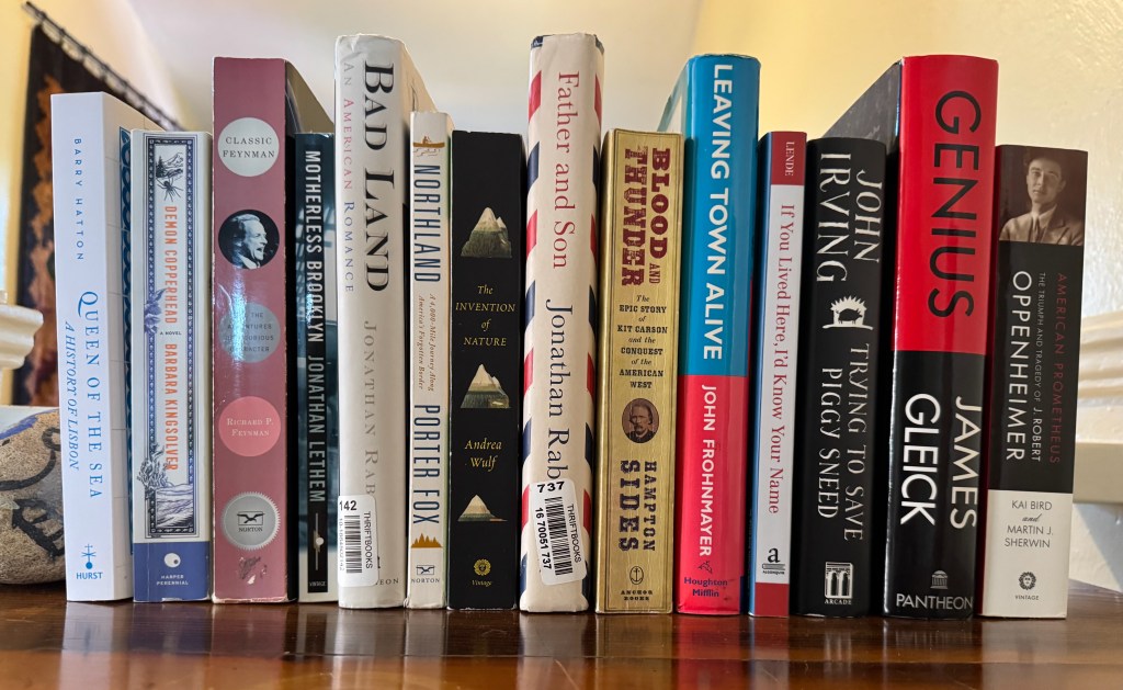 Some of my 2025 reading, whose theme was wandering through my shelves or used bookstores from Portland to Denton and places in between.